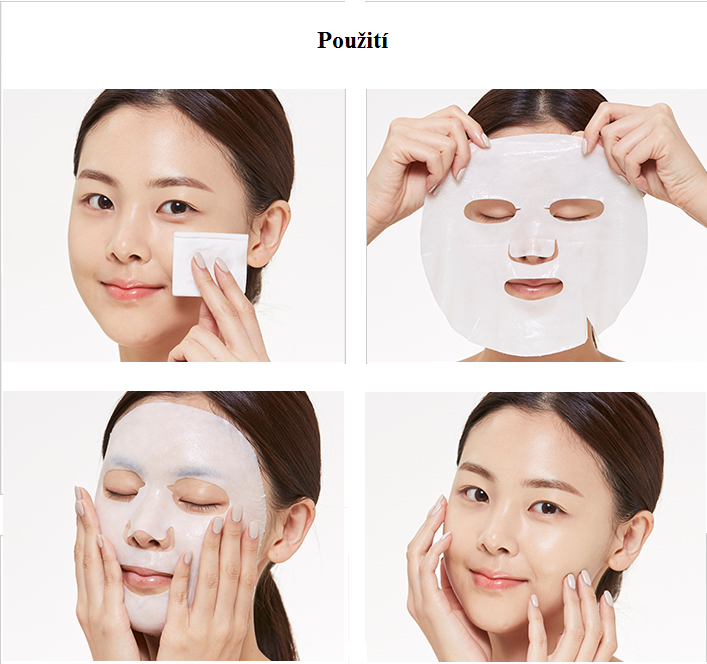 Po vyčištění pleti a aplikaci toneru vyndejte masku z obalu a jemně přiložte na obličej. Nechte působit 15 - 20 minut. Poté masku sundejte a zbývající esenci vklepejte do pokožky. Nesmývejte.